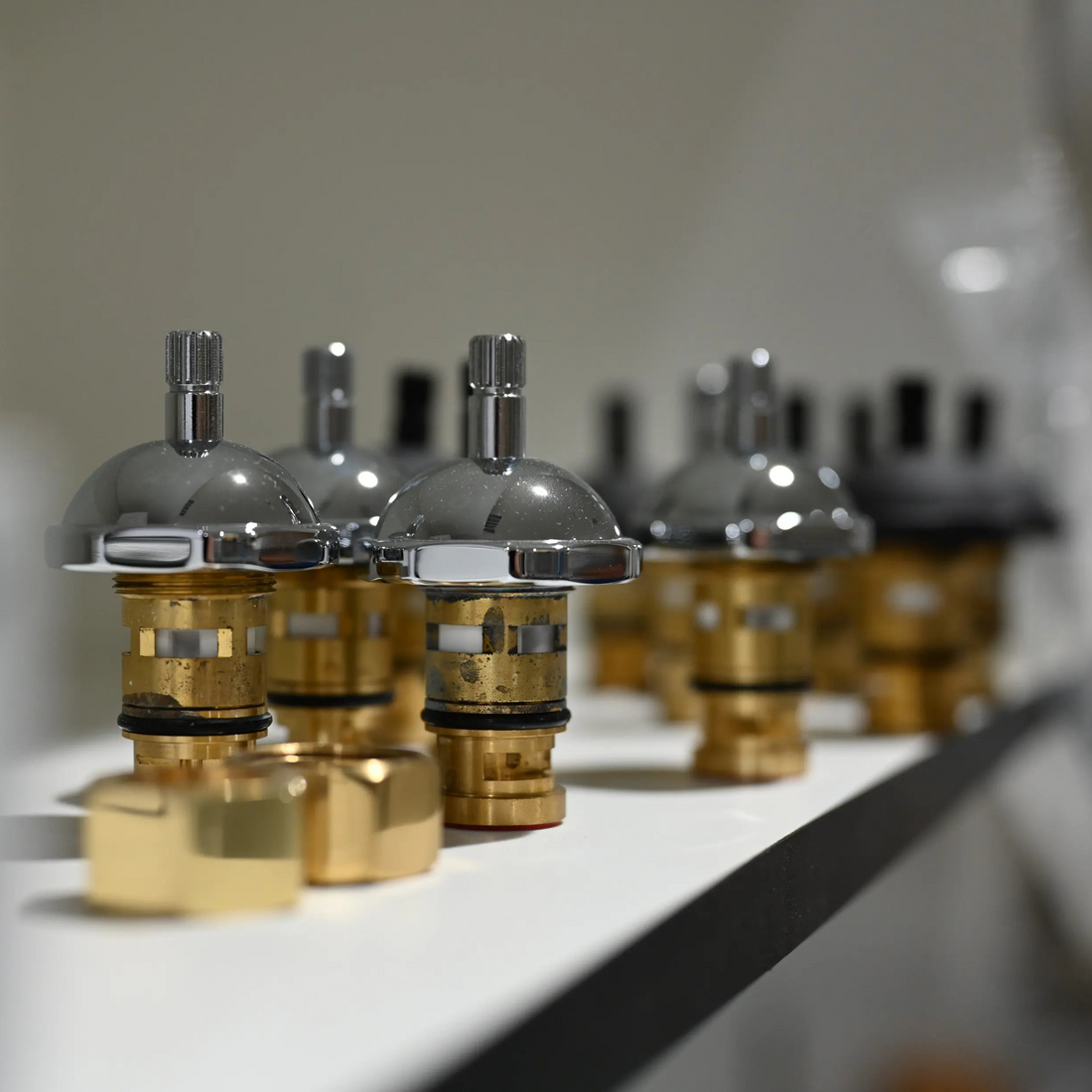 For years the plumbing industry used a stem with threads and a bib washer on the end of the stem. The disadvantage was that the washers would wear out and would have to be replaced or the valve could be ruined. The new stems used in our faucets use 2 ceramic discs that rotate when the stem turns, allowing the water to flow or shut off. The wear on these discs is so minimal that the valve cartridge can last for many years.