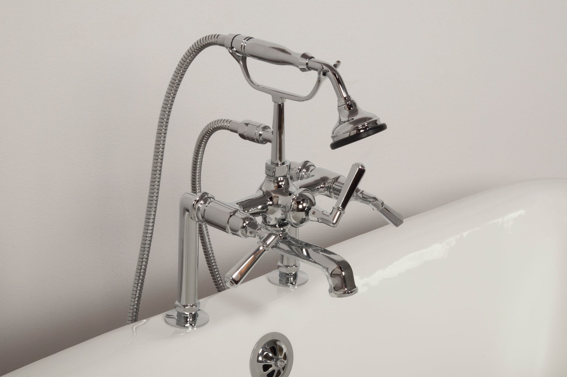 Strom Living British Telephone Deck Mount Tub Faucet with Handheld Shower and Deco Lever Handles