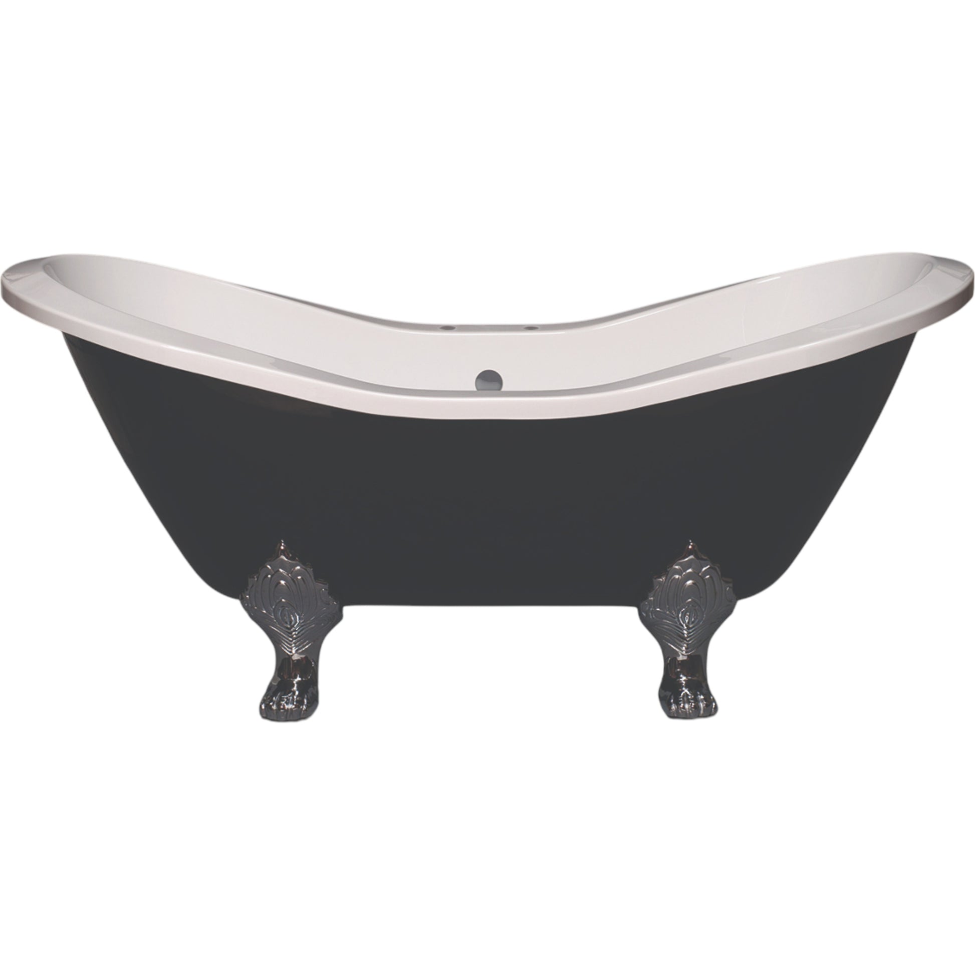 The Strom Living Summit Acrylic 6' Double Slipper Clawfoot Tub is an elegant centerpiece for any bathroom, designed to offer both comfort and style. Its black exterior with a white interior provides a stunning contrast, making it a versatile choice for both modern and traditional bathrooms. This 72-inch double slipper tub features the classic Lion Paw foot style and comes with an included drain for easy installation. The 7-inch rim faucet drillings are perfectly positioned for your preferred deck mount faucets. With a water volume of 68 gallons, this tub is designed for soaking in comfort with a seating area of 34.6 inches x 15 inches. Elevate your bath experience with this beautifully crafted tub that combines luxurious design and practical functionality.