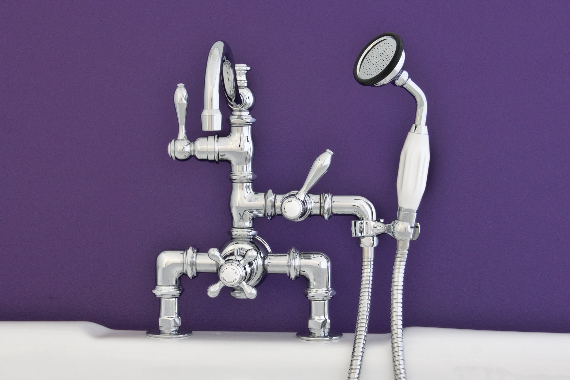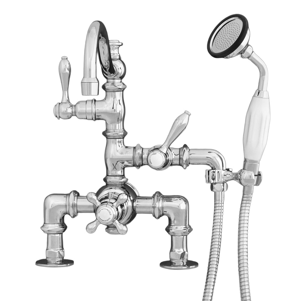 The Strom Living Thermostatic Deck Mount Tub Faucet with a fixed arched spout combines classic design with advanced technology, bringing both beauty and functionality to your bathroom. Featuring thermostatic control, this faucet ensures your water stays at a safe and consistent temperature, while the built-in anti-syphon spout ensures water safety. Available in a variety of finishes, this faucet complements various bathroom styles, providing luxury and reliability for years to come. The faucet includes a convenient handheld shower with hose and bracket for added versatility.